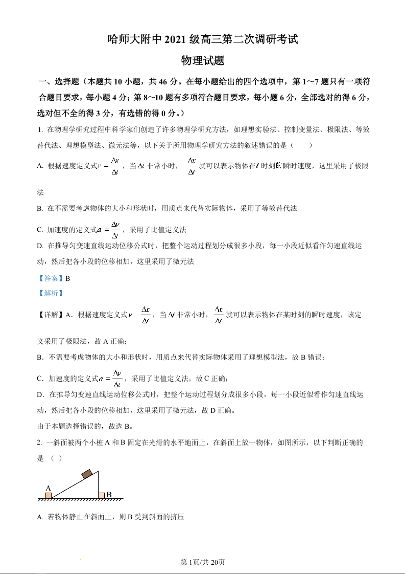 黑龙江省哈尔滨师范大学附属中学2024届高三上学期第二次调研考试物理(精品解析版)
