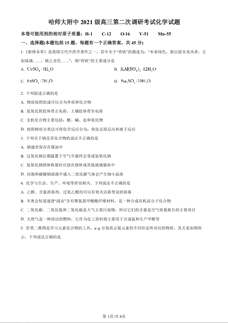 黑龙江省哈尔滨师范大学附属中学2024届高三上学期第二次调研考试化学(原卷版)