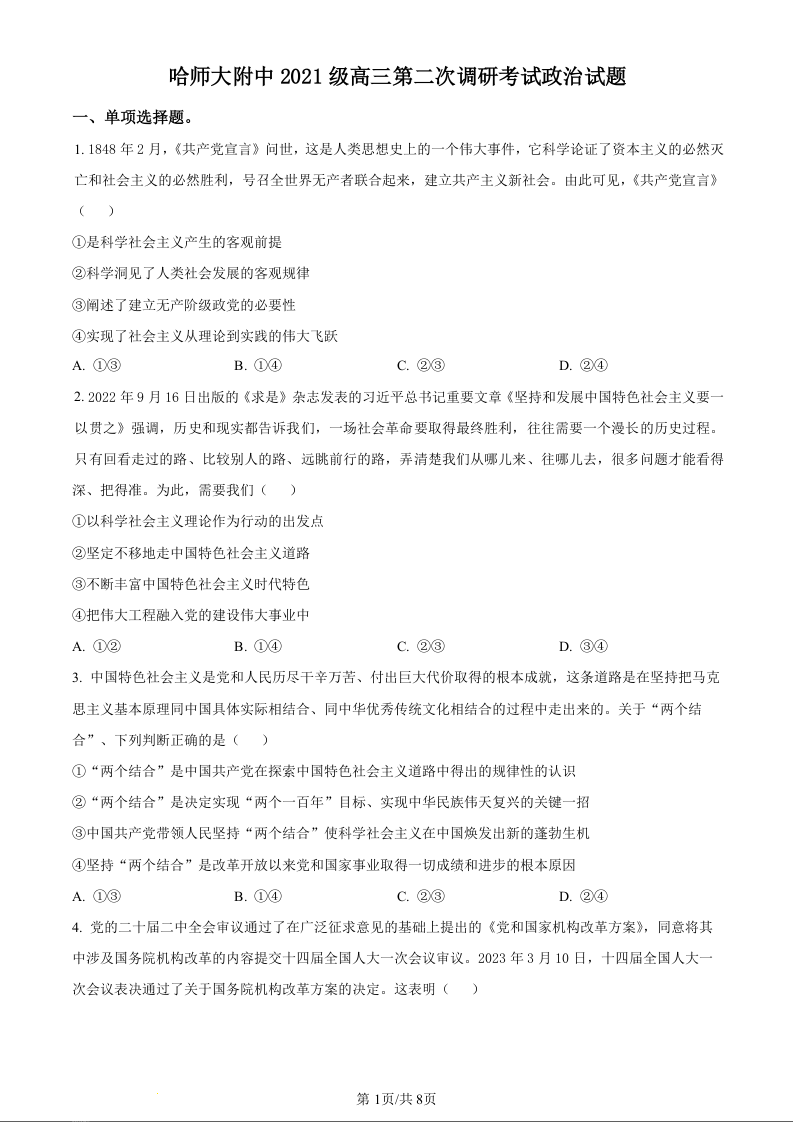黑龙江省哈尔滨师范大学附属中学2024届高三上学期第二次调研考试政治(原卷版)