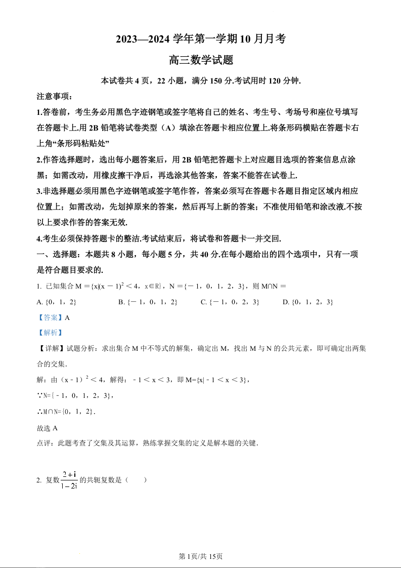 河北省邯郸市永年区第二中学2024届高三上学期10月月考数学(精品解析版)