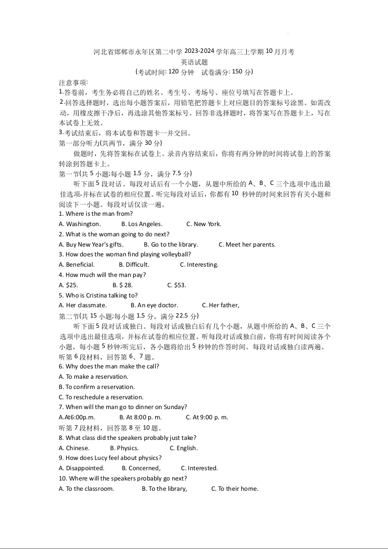 河北省邯郸市永年区第二中学2024届高三上学期10月月考英语