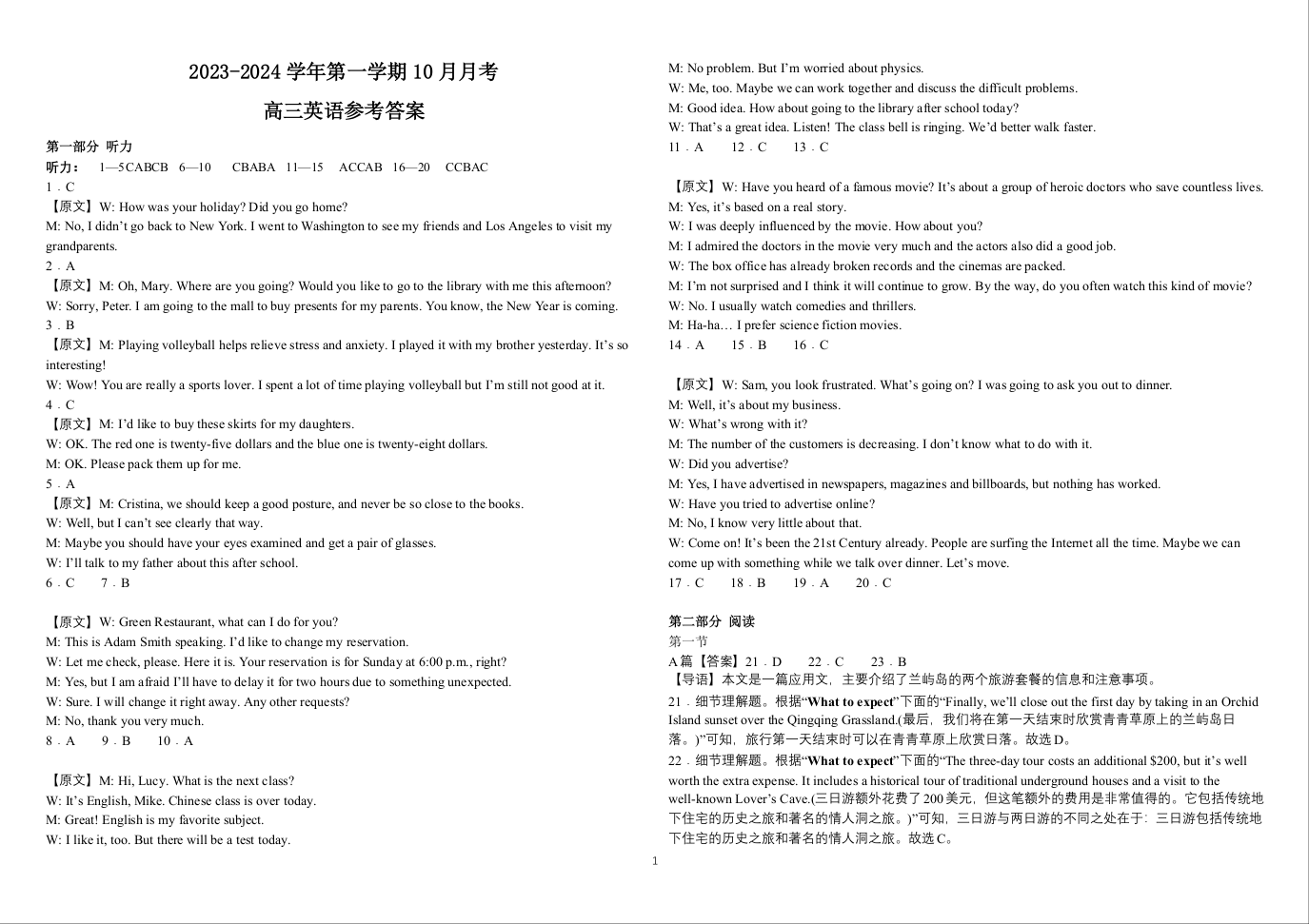河北省邯郸市永年区第二中学2024届高三上学期10月月考英语答案