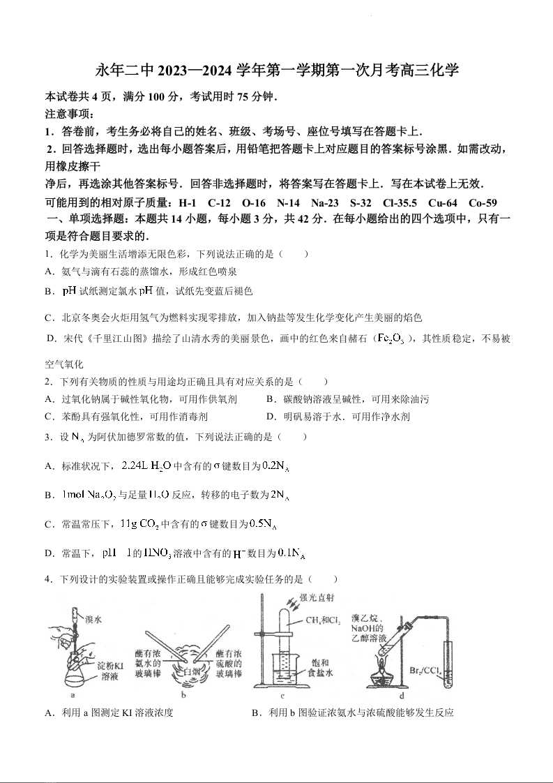 河北省邯郸市永年区第二中学2024届高三上学期10月月考化学+答案