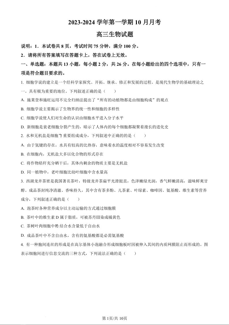 河北省邯郸市永年区第二中学2024届高三上学期10月月考生物(原卷版)