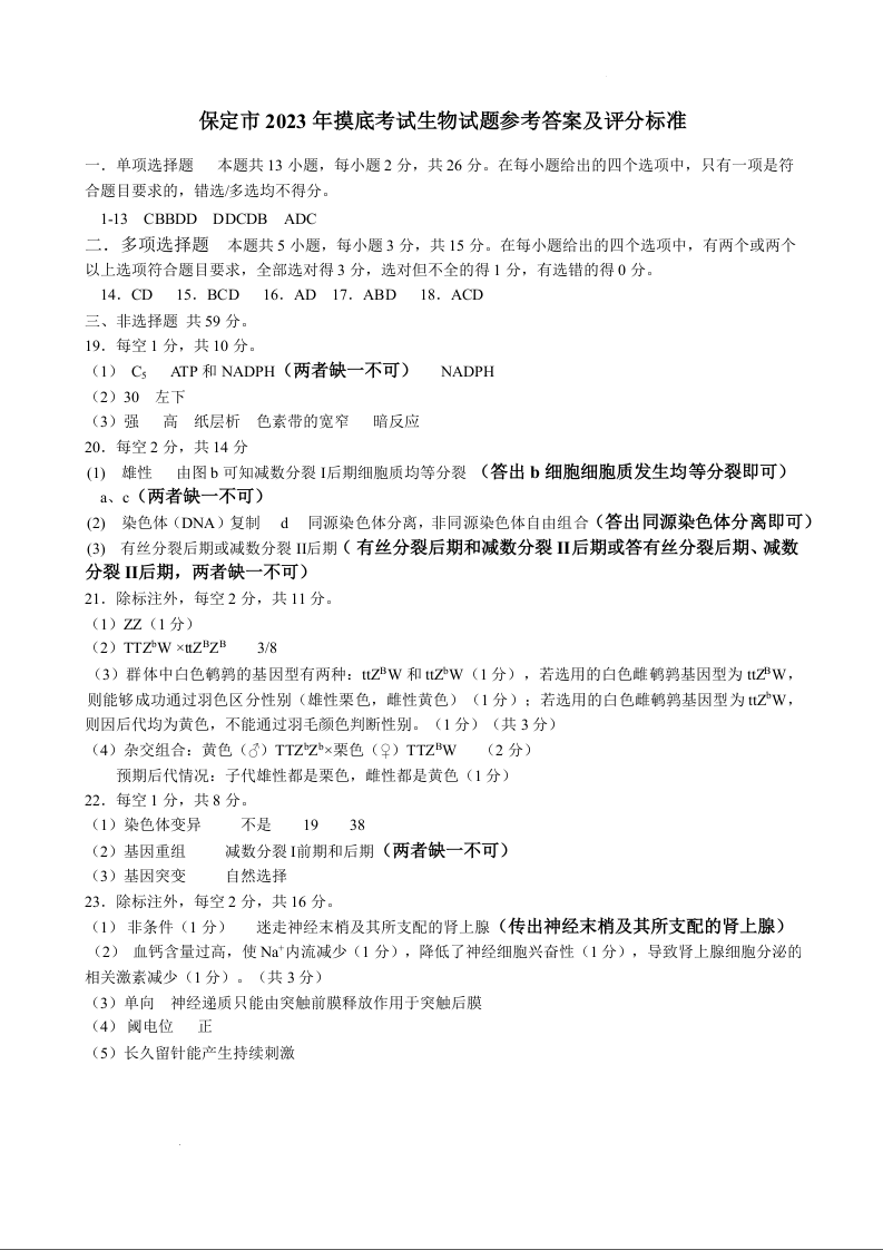 河北省保定市2024届高三上学期摸底考试(期中考试)生物答案