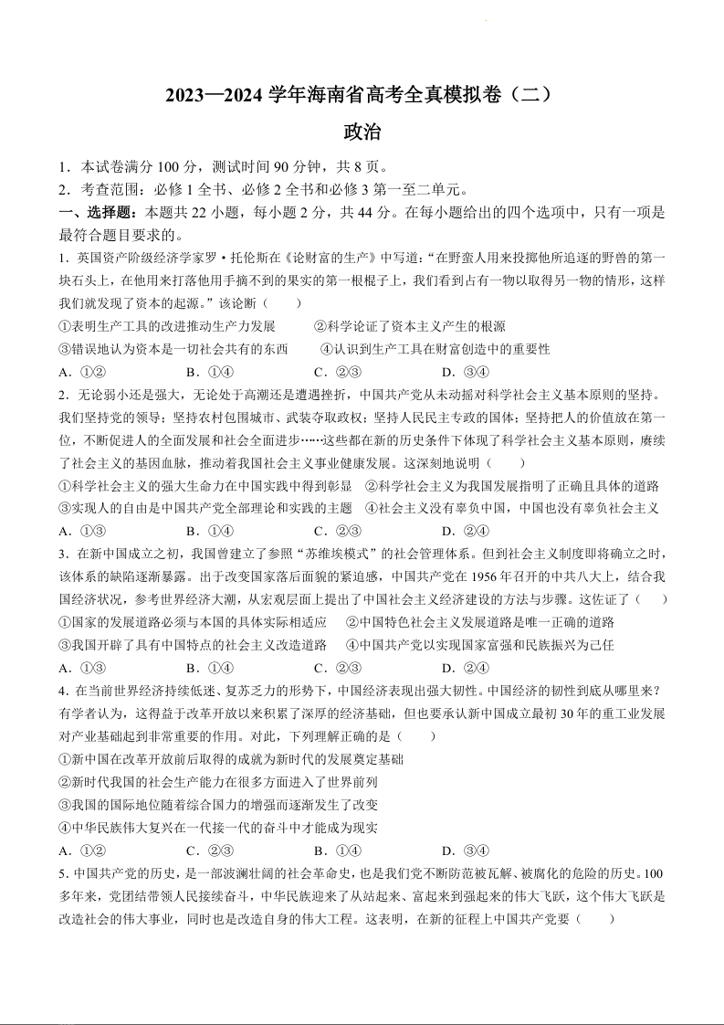海南省2024届高考全真模拟卷(二)政治+答案
