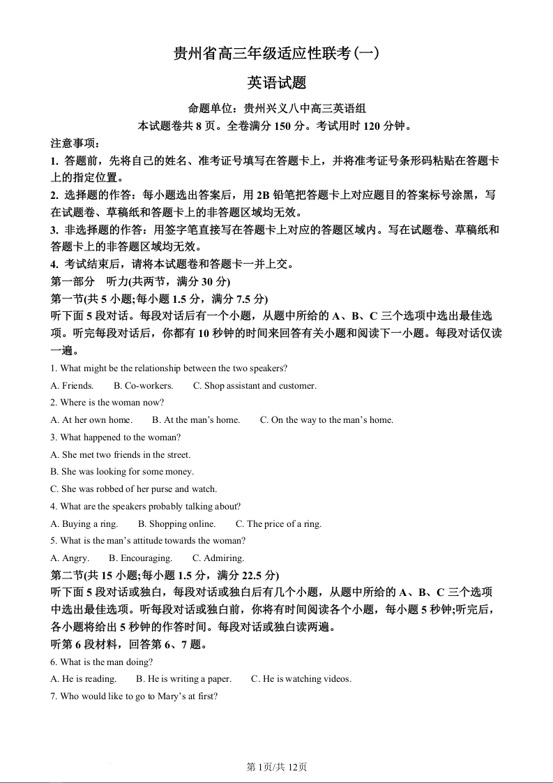 贵州省2024届高三上学期适应性联考(一)英语(原卷版)