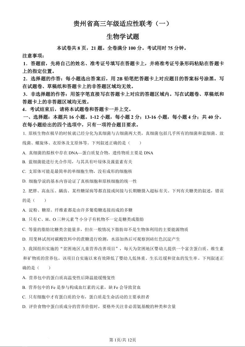 贵州省2024届高三上学期适应性联考(一)生物+答案