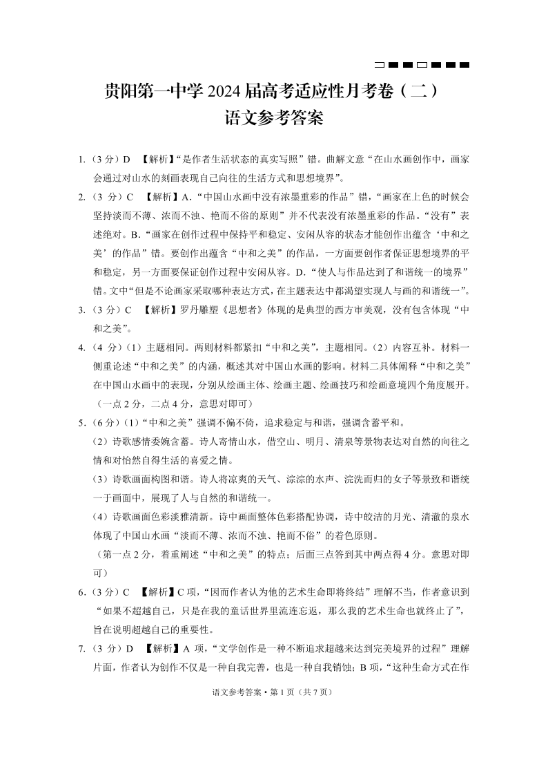 贵州省贵阳市第一中学2024届高三上学期高考适应性月考(二)语文答案