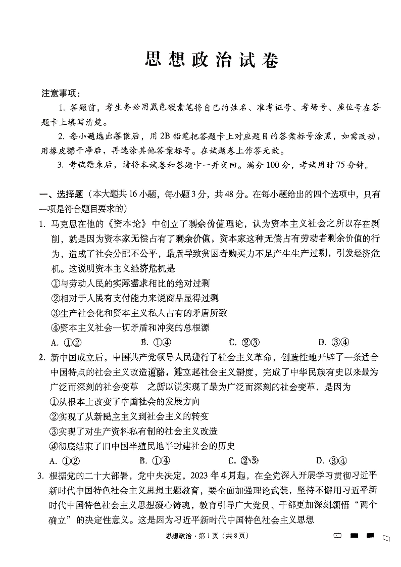 贵州省贵阳市第一中学2024届高三上学期高考适应性月考(二)思想政治