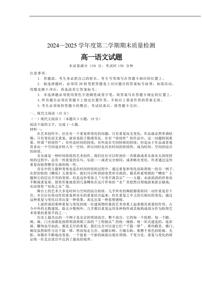 高一语文+答案--安徽省黄山市2024-2025学年高一下学期期末考试