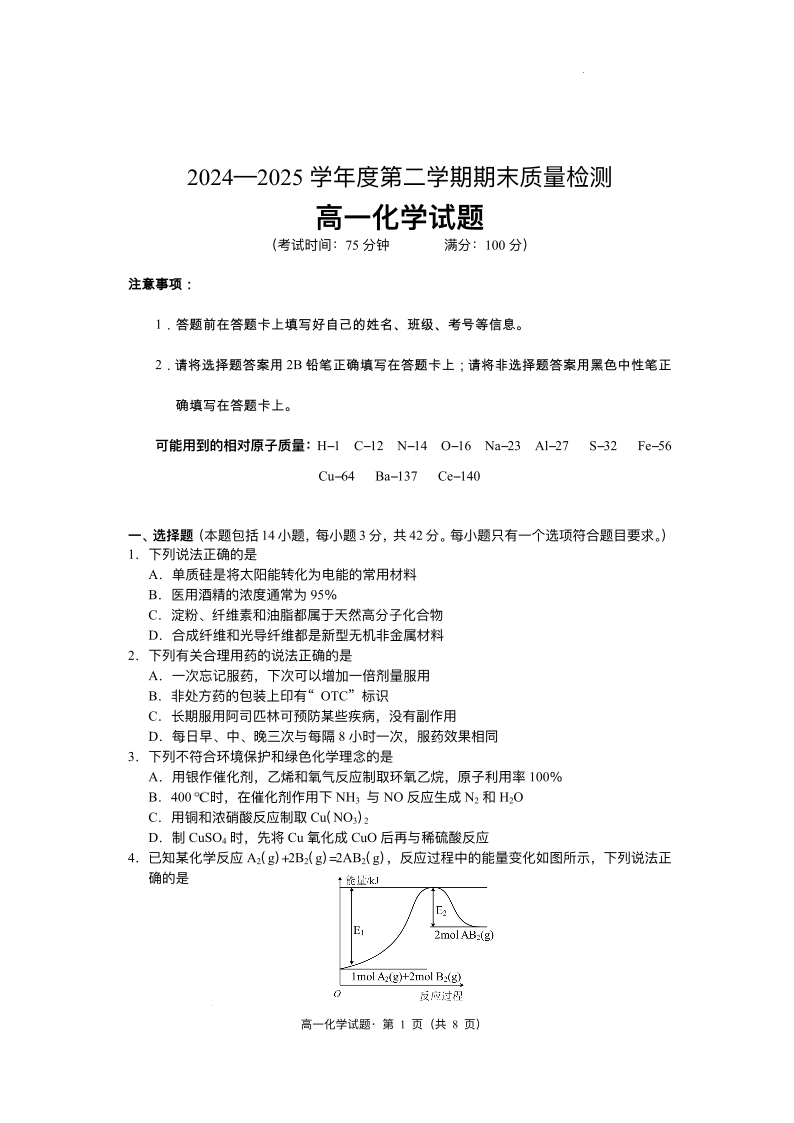 高一化学--安徽省黄山市2024-2025学年高一下学期期末考试