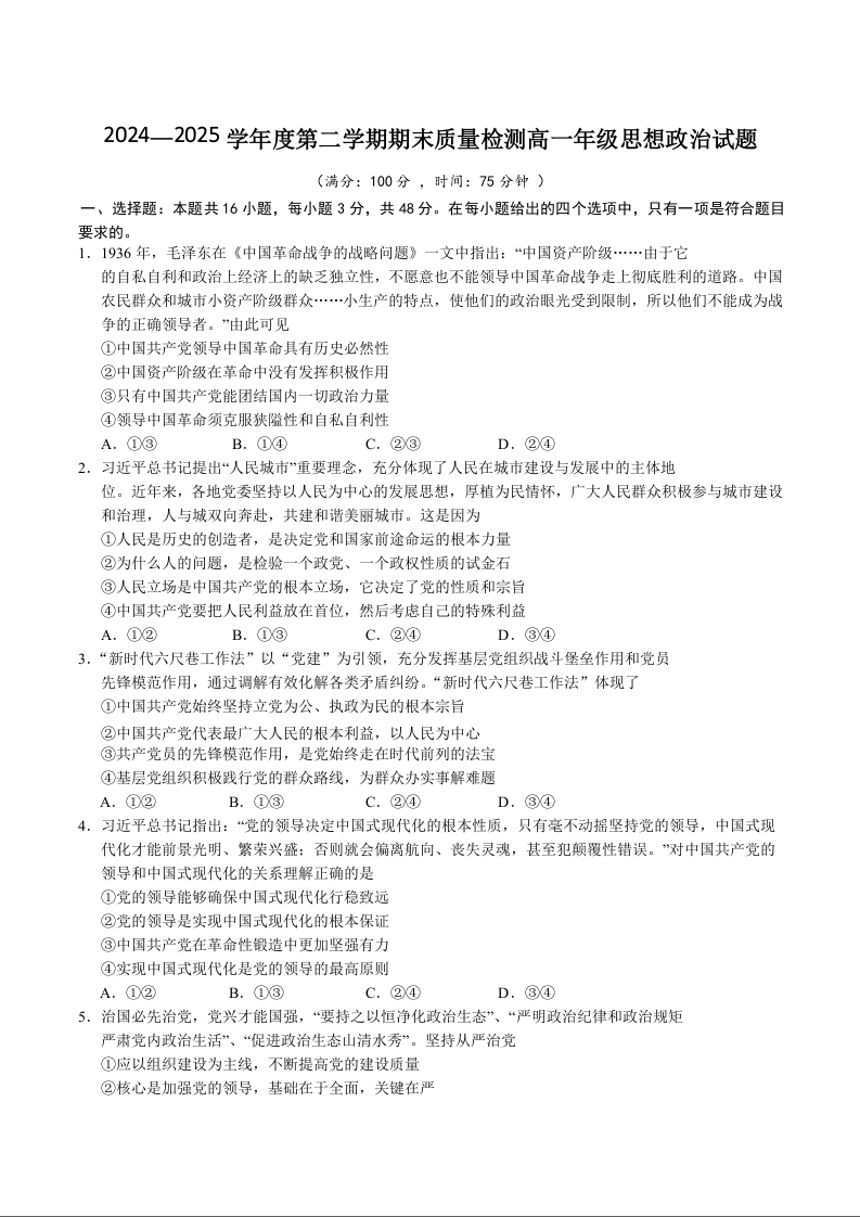 高一政治+答案--安徽省黄山市2024-2025学年高一下学期期末考试
