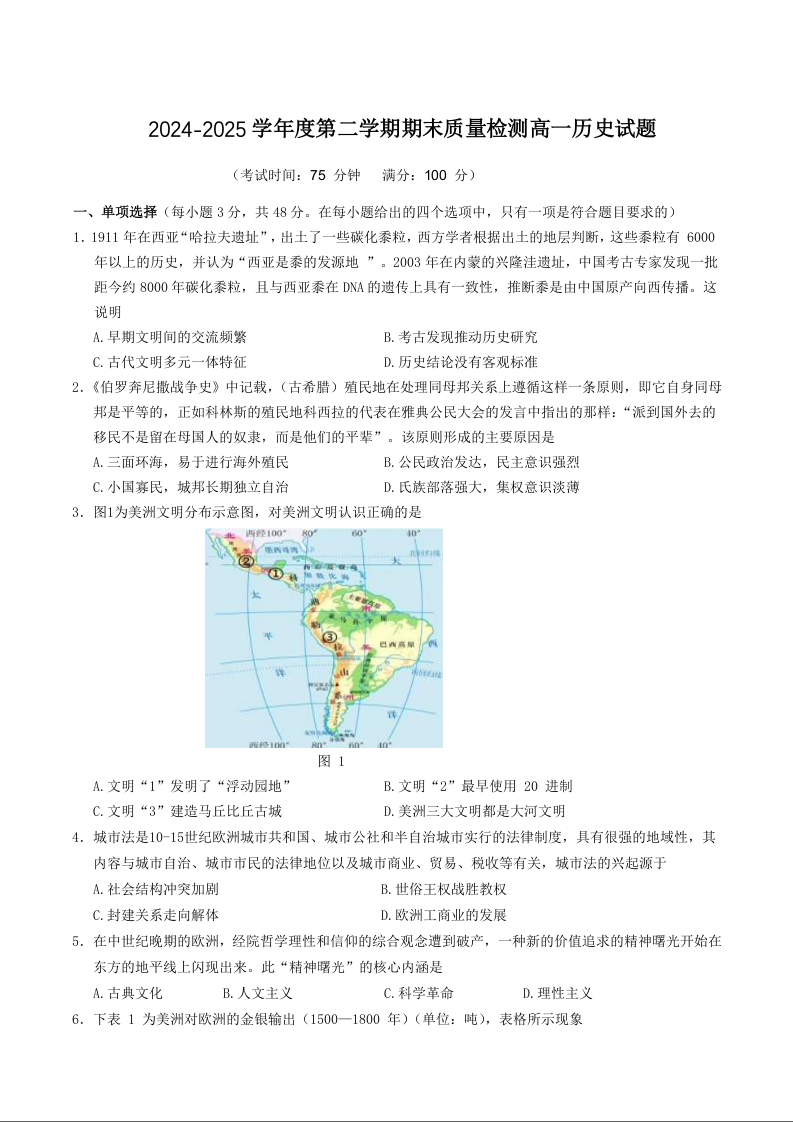 高一历史--安徽省黄山市2024-2025学年高一下学期期末考试