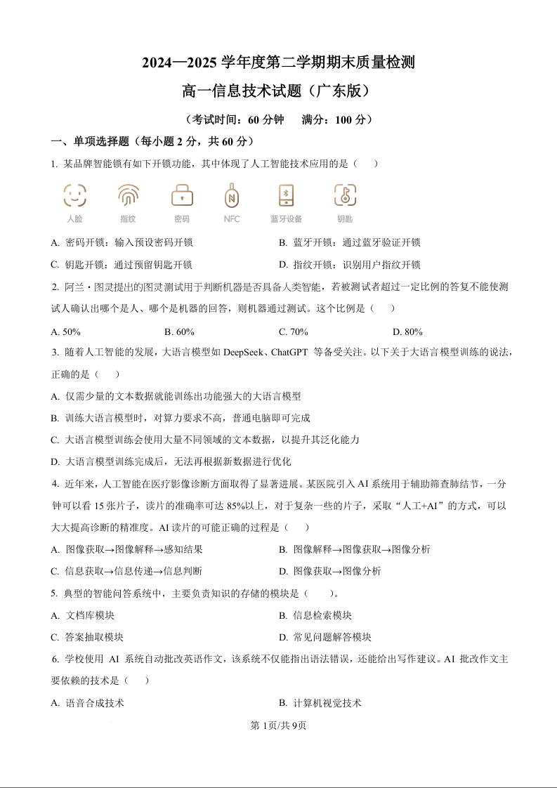 高一信息技术(原卷版)--安徽省黄山市2024-2025学年高一下学期期末考试