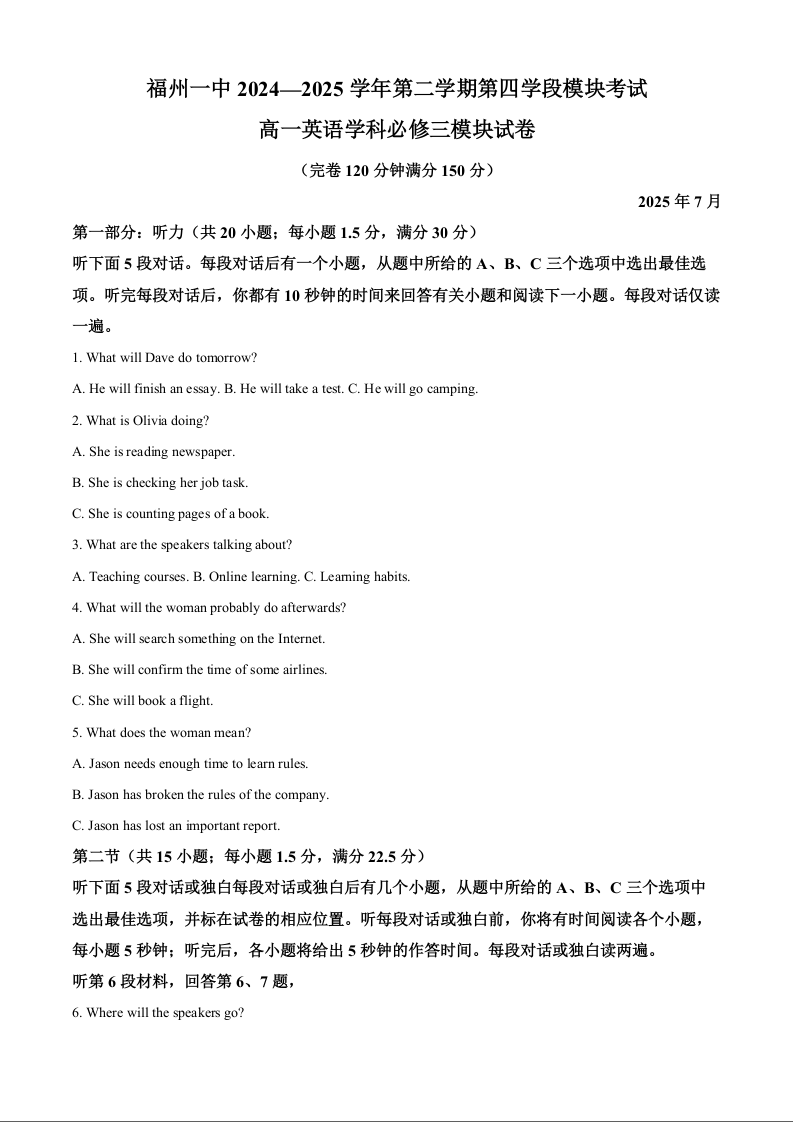 高一英语+答案--福建省福州第一中学2024-2025学年高一下学期7月期末考试