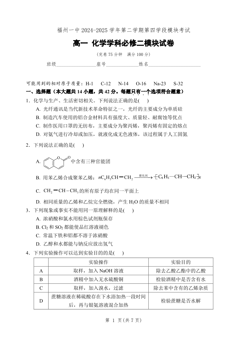 高一化学+答案--福建省福州第一中学2024-2025学年高一下学期7月期末考试
