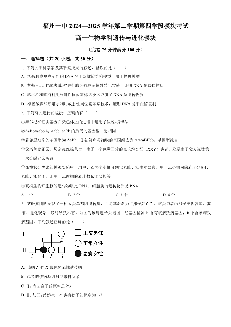 高一生物+答案--福建省福州第一中学2024-2025学年高一下学期7月期末考试