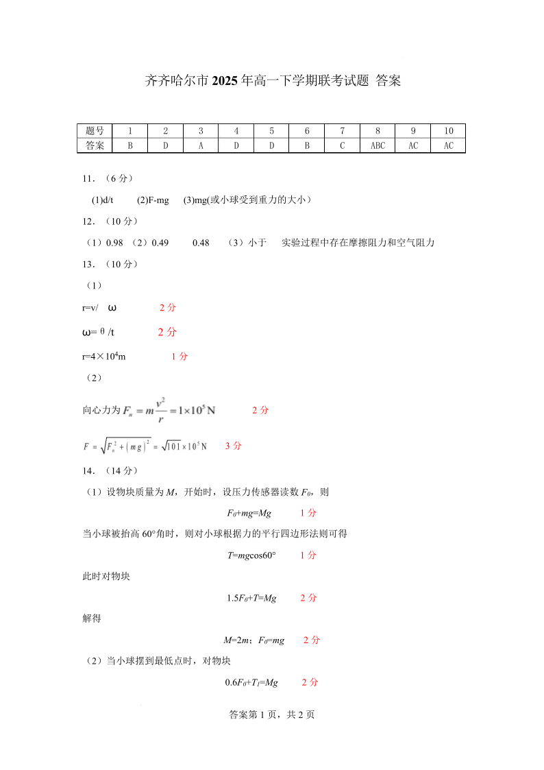高一物理答案--黑龙江省黑河市龙西北名校联盟2024-2025学年高一下学期7月期末考试