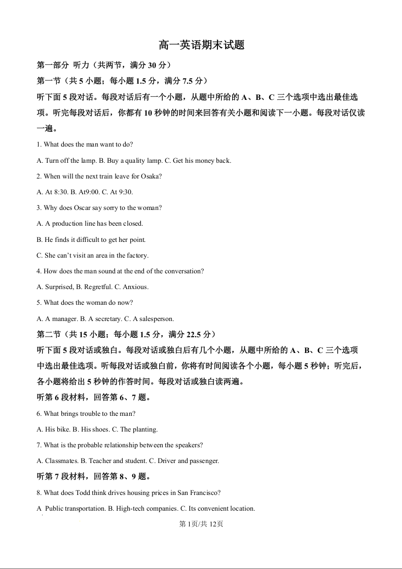 高一英语(原卷版)--吉林省通化市梅河口市第五中学2024-2025学年高一下学期7月期末考试