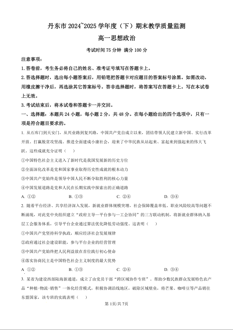 高一政治(原卷版)--辽宁省丹东市2024-2025学年高一下学期期末教学质量监测
