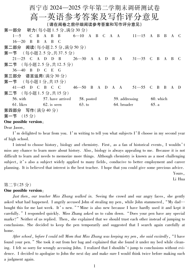高一英语答案--青海省西宁市2024-2025学年高一下学期末调研测试
