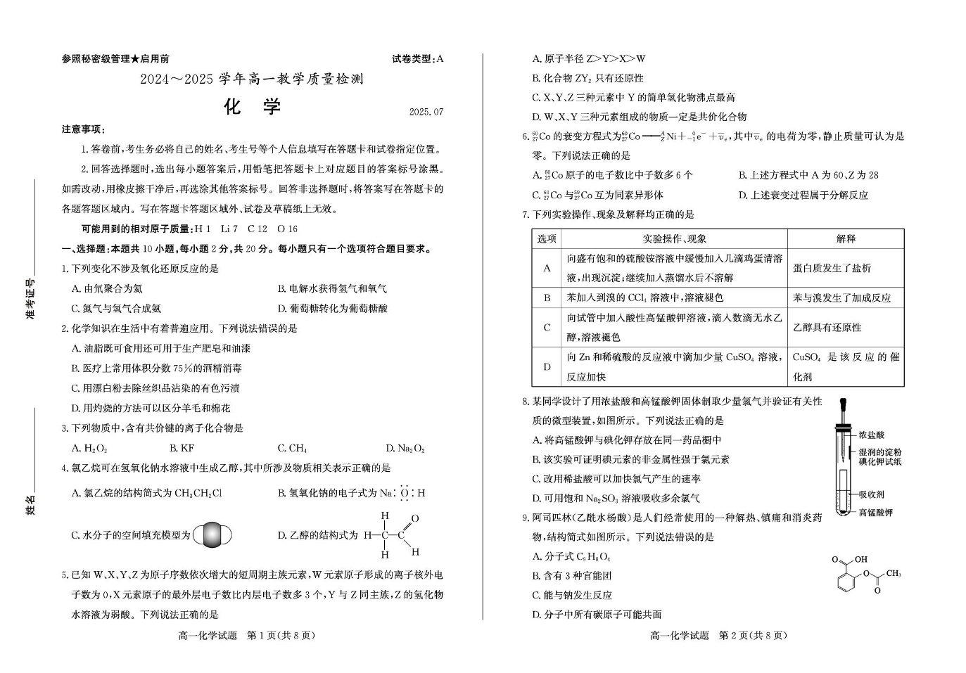 高一化学+答案--山东省枣庄市2024-2025学年高一下学期期末考试