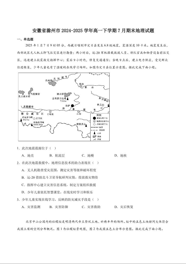高一地理+答案--安徽省滁州市2024-2025学年高一下学期期末考试
