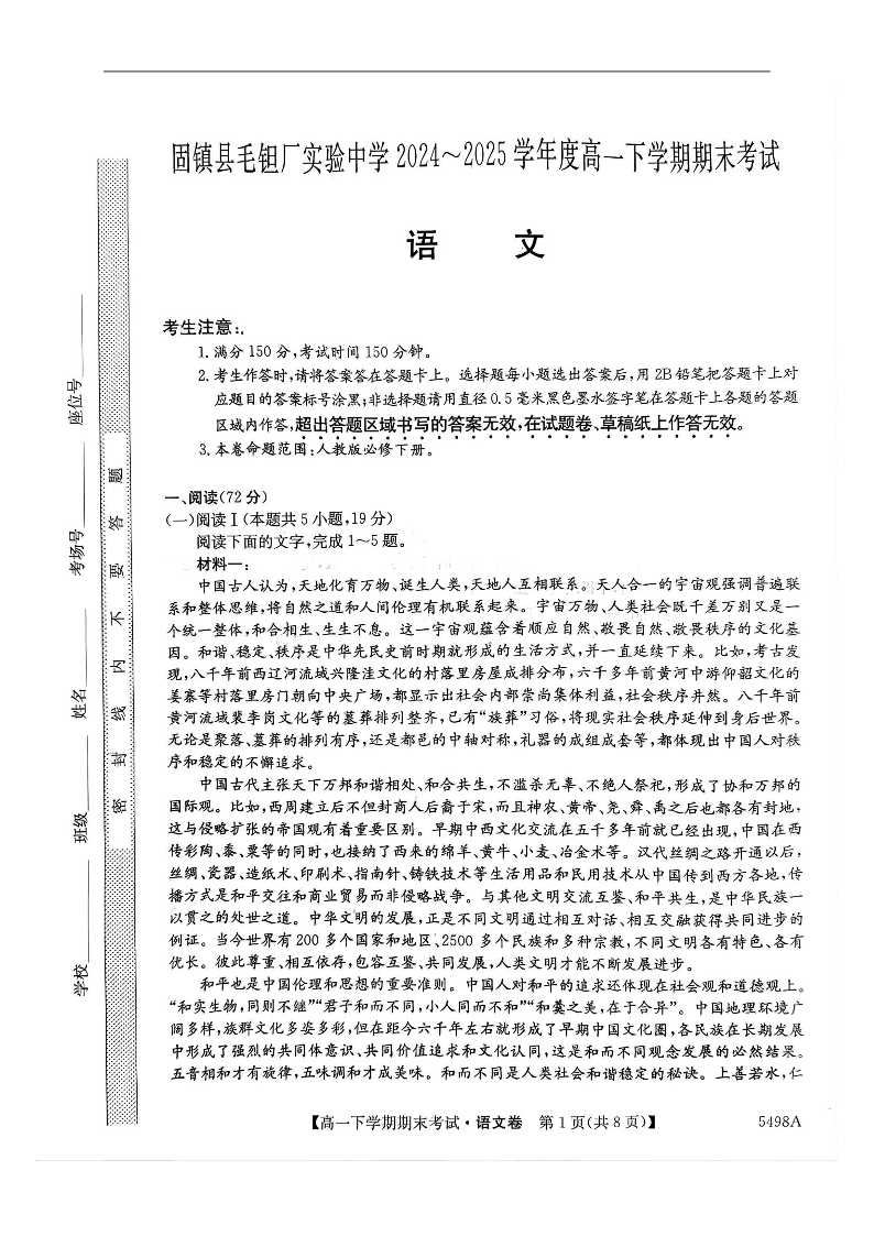 高一语文--安徽省毛钽厂实验中学2024-2025学年高一下学期7月期末考试