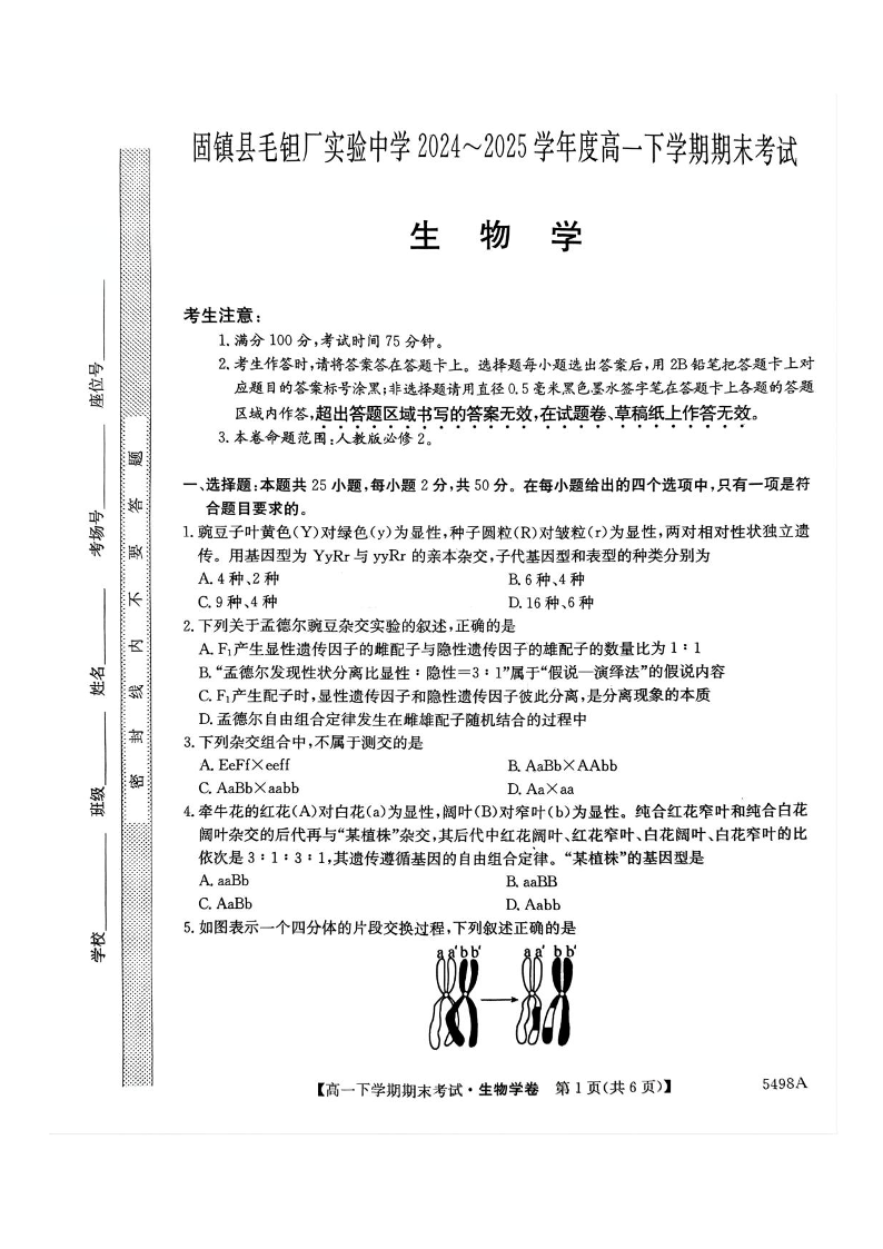 高一生物+答案--安徽省毛钽厂实验中学2024-2025学年高一下学期7月期末考试