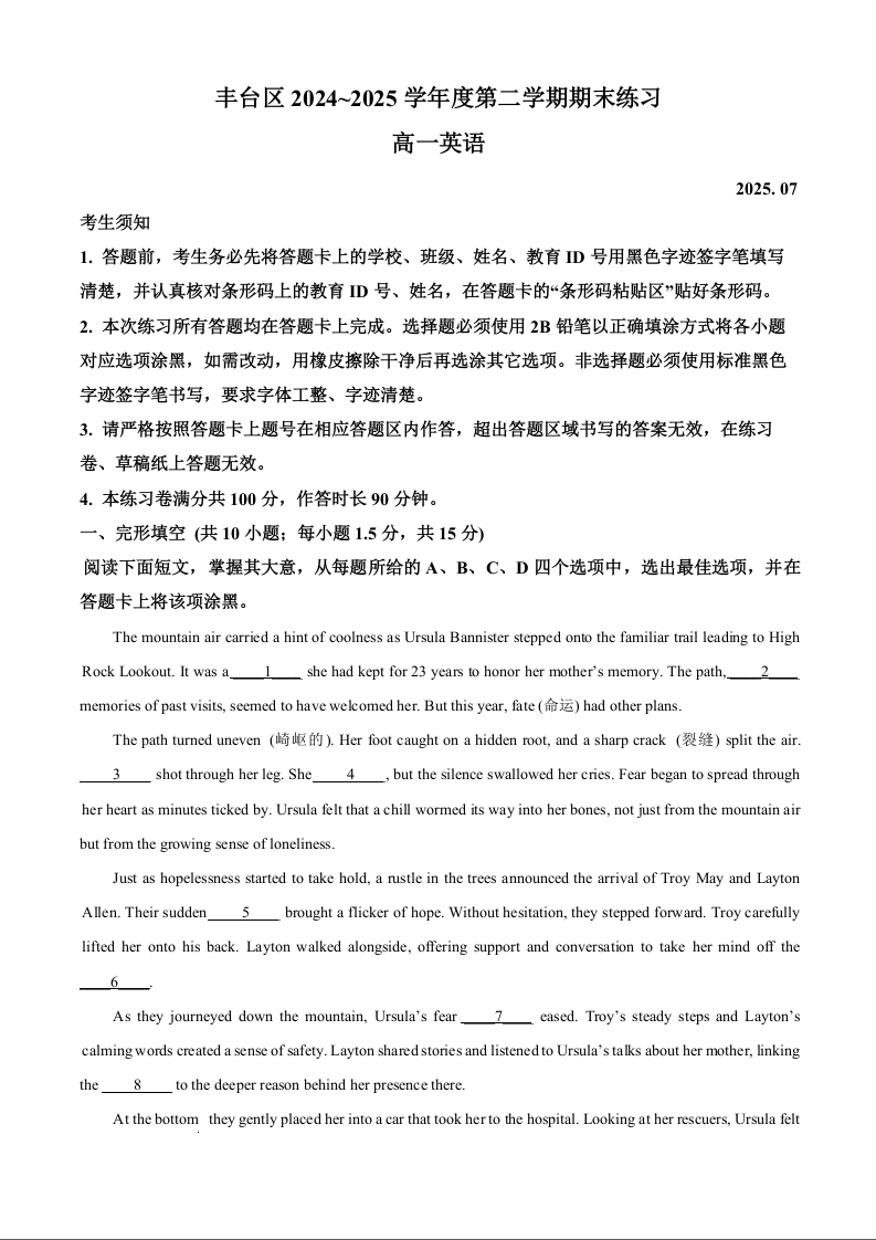 高一英语+答案--北京市丰台区2024-2025学年高一下学期期末