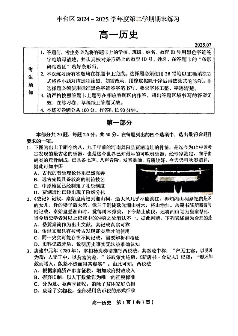 高一历史--北京市丰台区2024-2025学年高一下学期期末