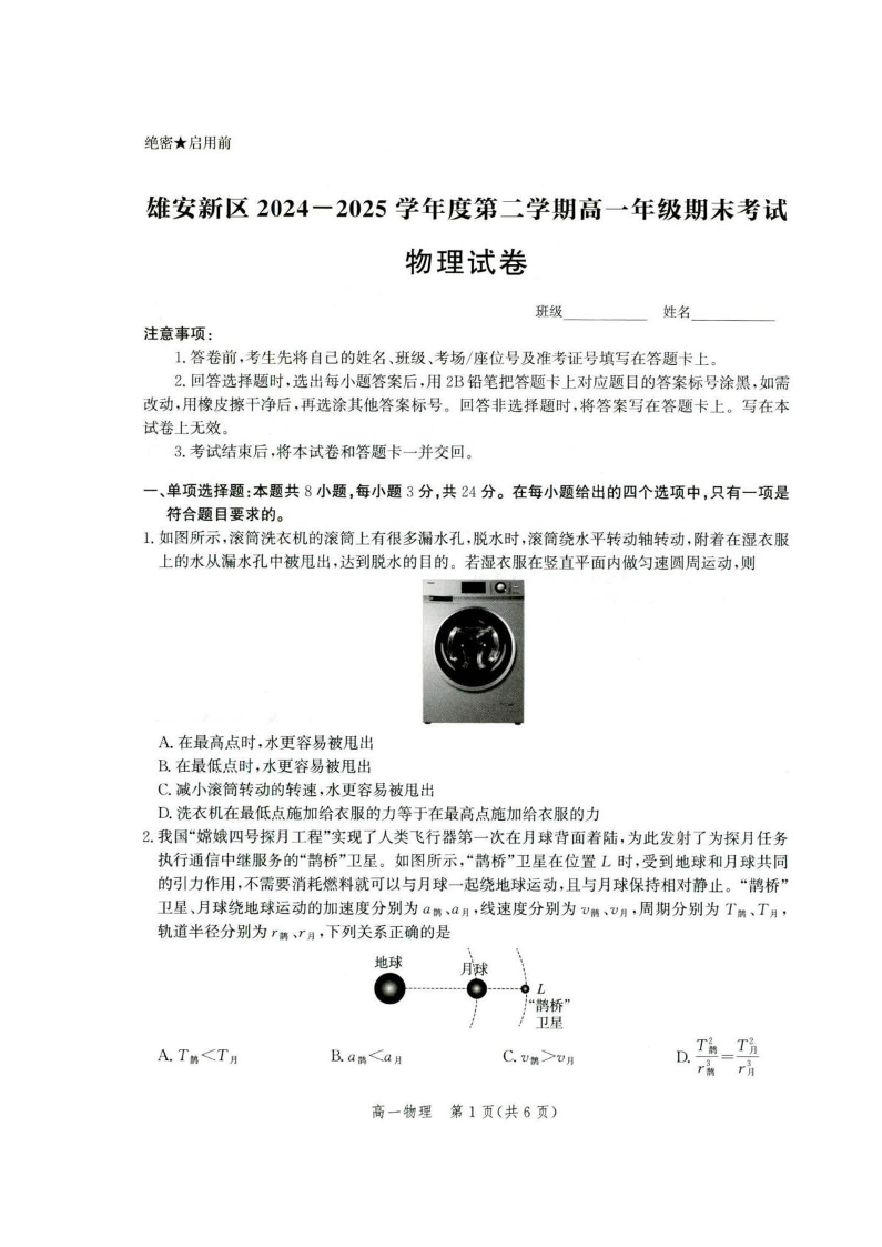 高一物理--河北省雄安新区雄安十校2024-2025学年高一下学期期末考试