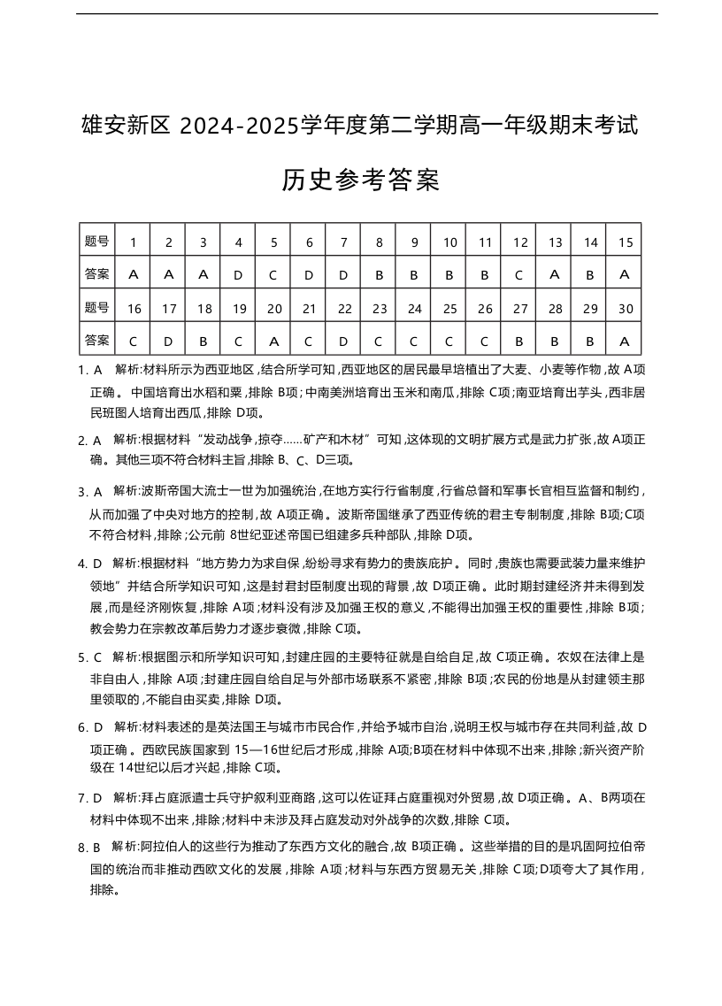 高一历史答案--河北省雄安新区雄安十校2024-2025学年高一下学期期末考试