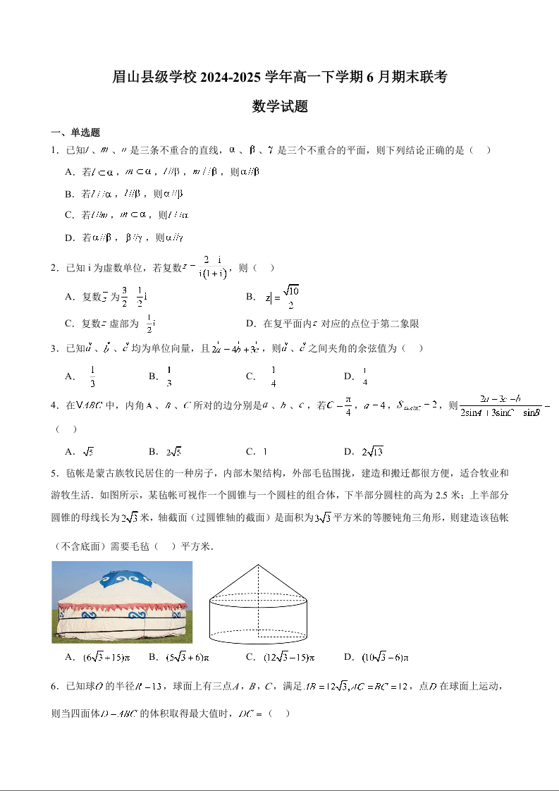 高一数学+答案--四川省眉山市县级学校2024-2025学年高一下学期期末联考