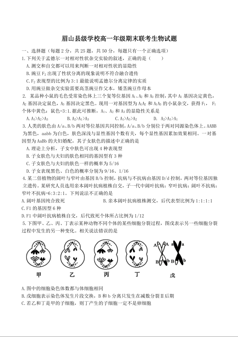 高一生物+答案--四川省眉山市县级学校2024-2025学年高一下学期期末联考