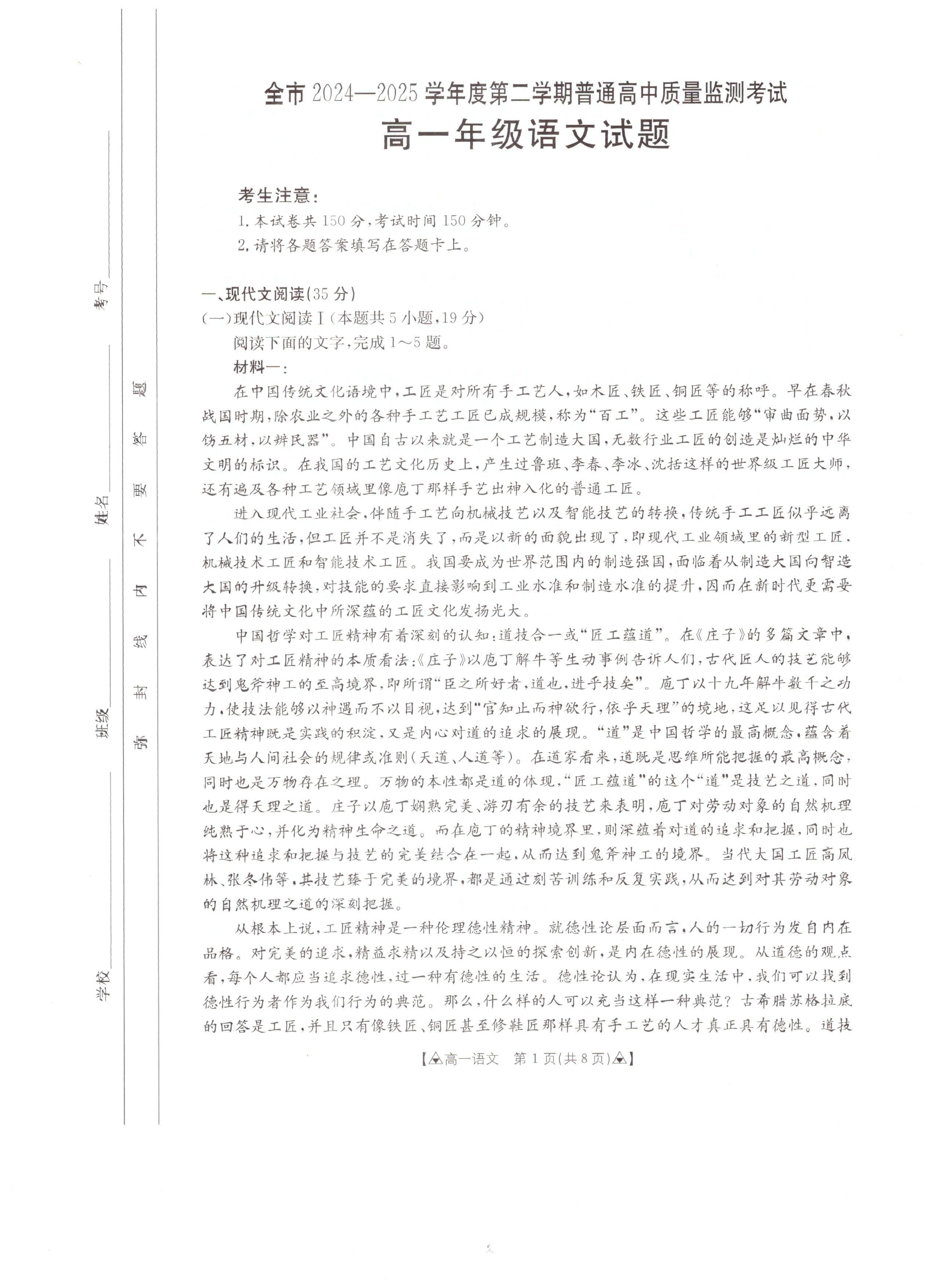 高一语文+答案--贵州省安顺市2024-2025学年高一下学期期末考试