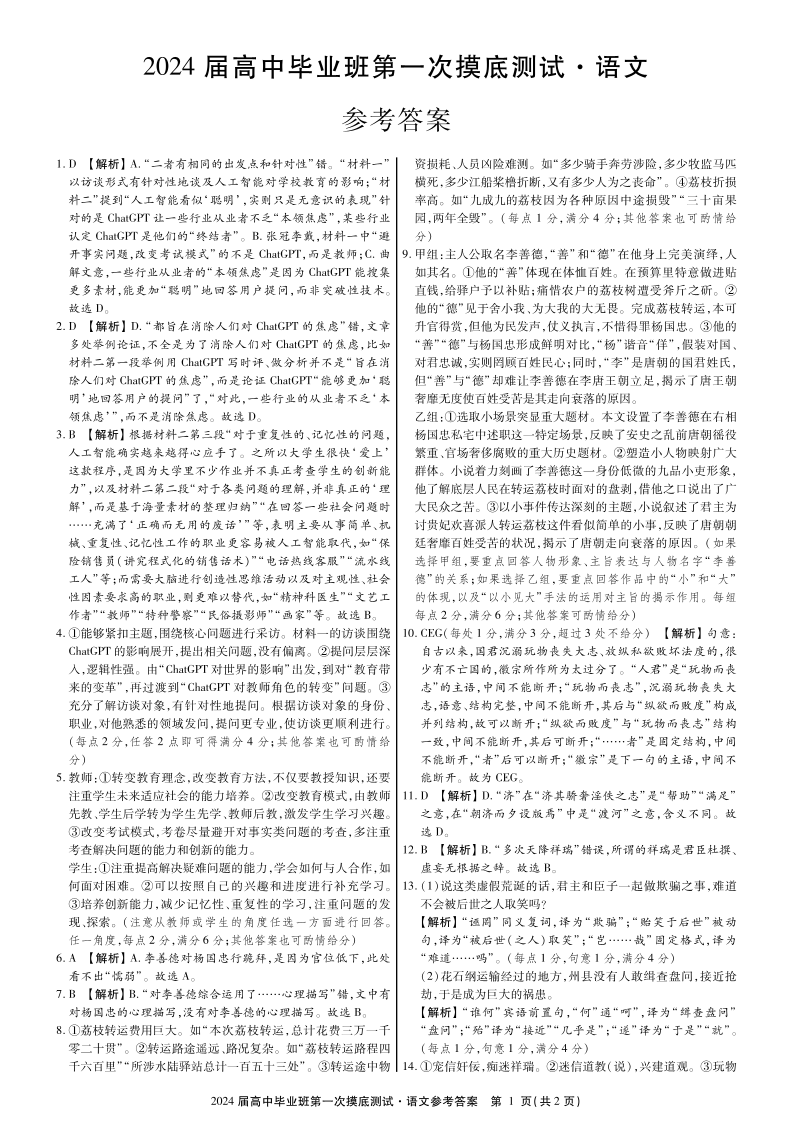 广西省2024届高中毕业班第一次摸底测试语文答案