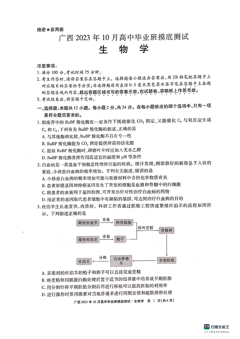广西省2024届高中毕业班第一次摸底测试生物