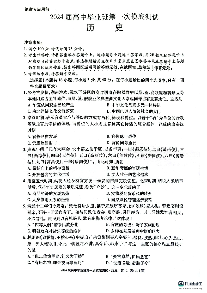 广西省2024届高中毕业班第一次摸底测试历史