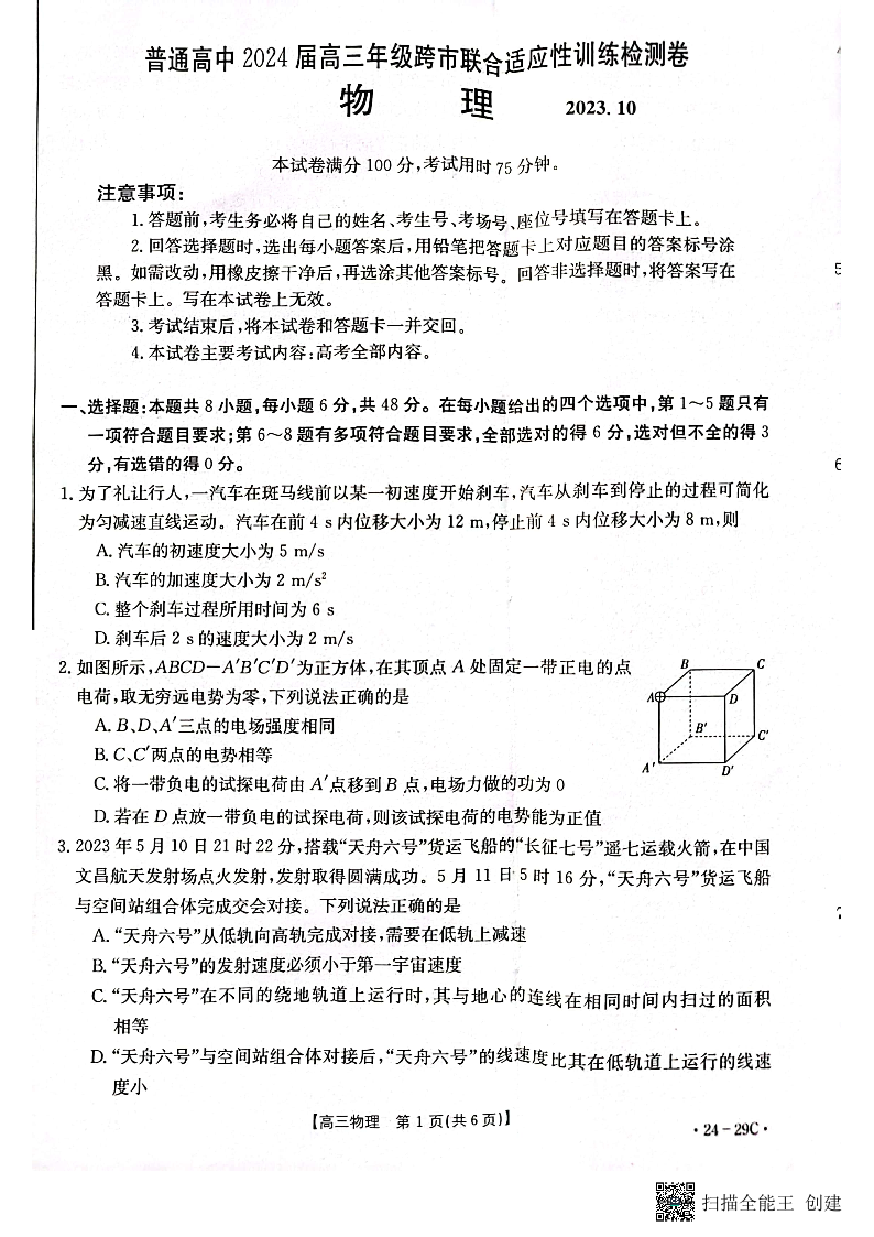 广西普通高中2024届高三年级跨市联合适应性训练检测卷物理