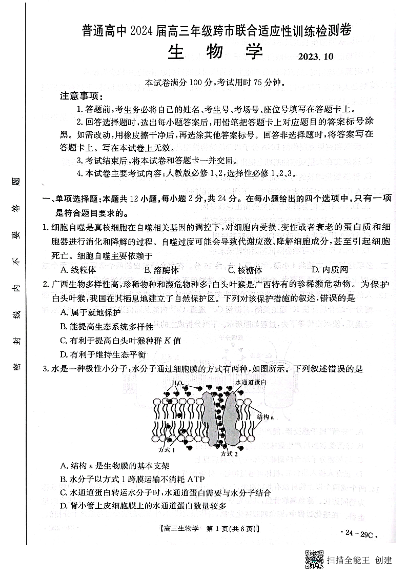 广西普通高中2024届高三年级跨市联合适应性训练检测卷生物