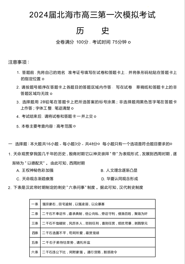 广西北海市2024届高三第一次模拟考试历史