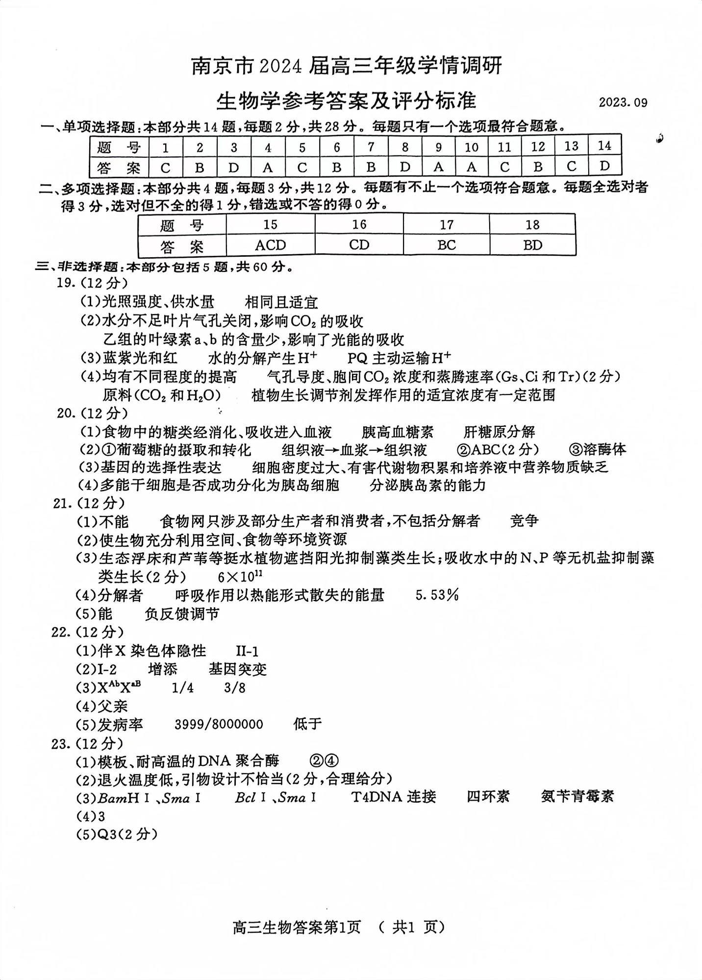 江苏省南京市 2024 届高三年级9月学情调研生物答案