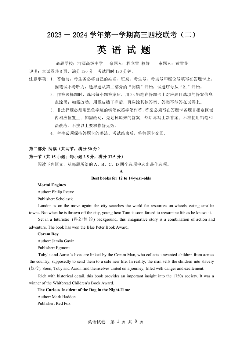 广东省四校联考2024届高三上学期10月月考英语