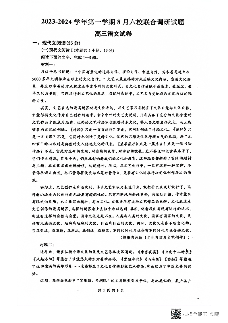 江苏省南京市六校联合体2024届高三上学期8月调研语文