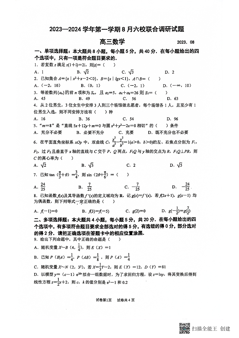 江苏省南京市六校联合体2024届高三上学期8月调研数学