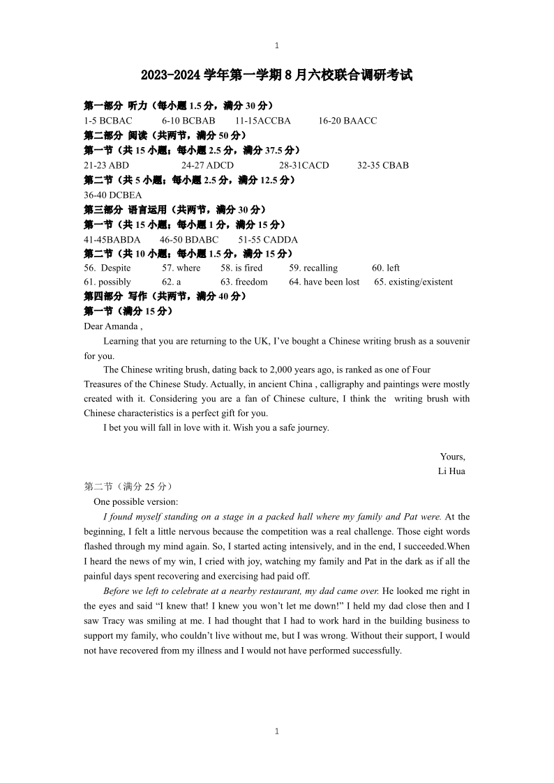 江苏省南京市六校联合体2024届高三上学期8月调研英语答案