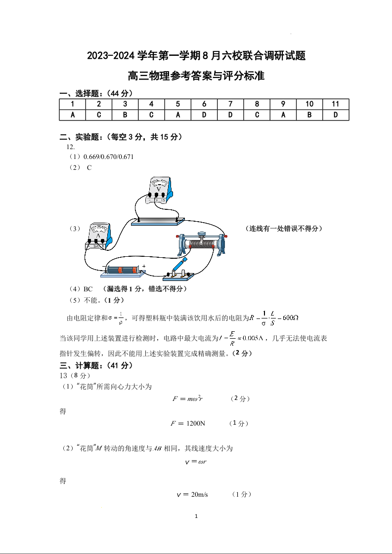 江苏省南京市六校联合体2024届高三上学期8月调研物理答案