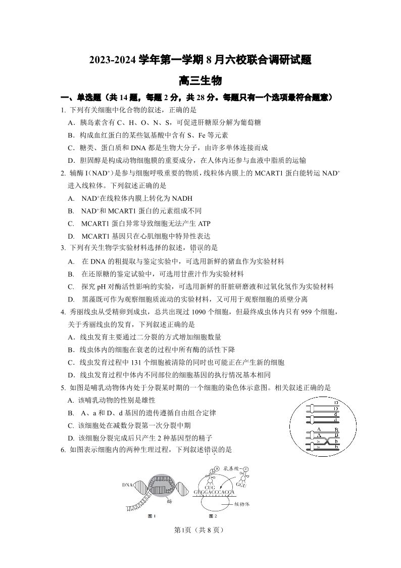 江苏省南京市六校联合体2024届高三上学期8月调研生物